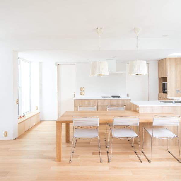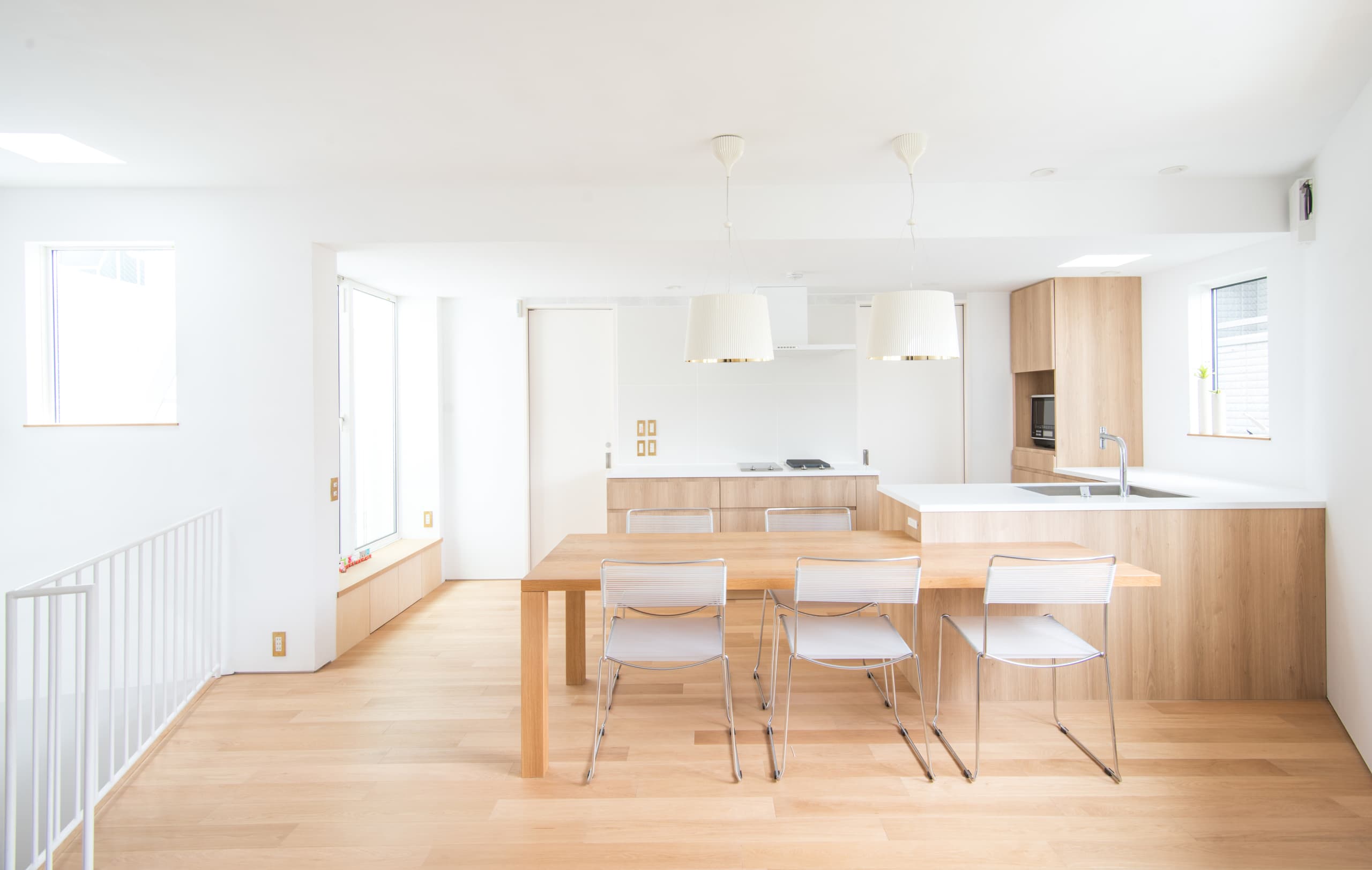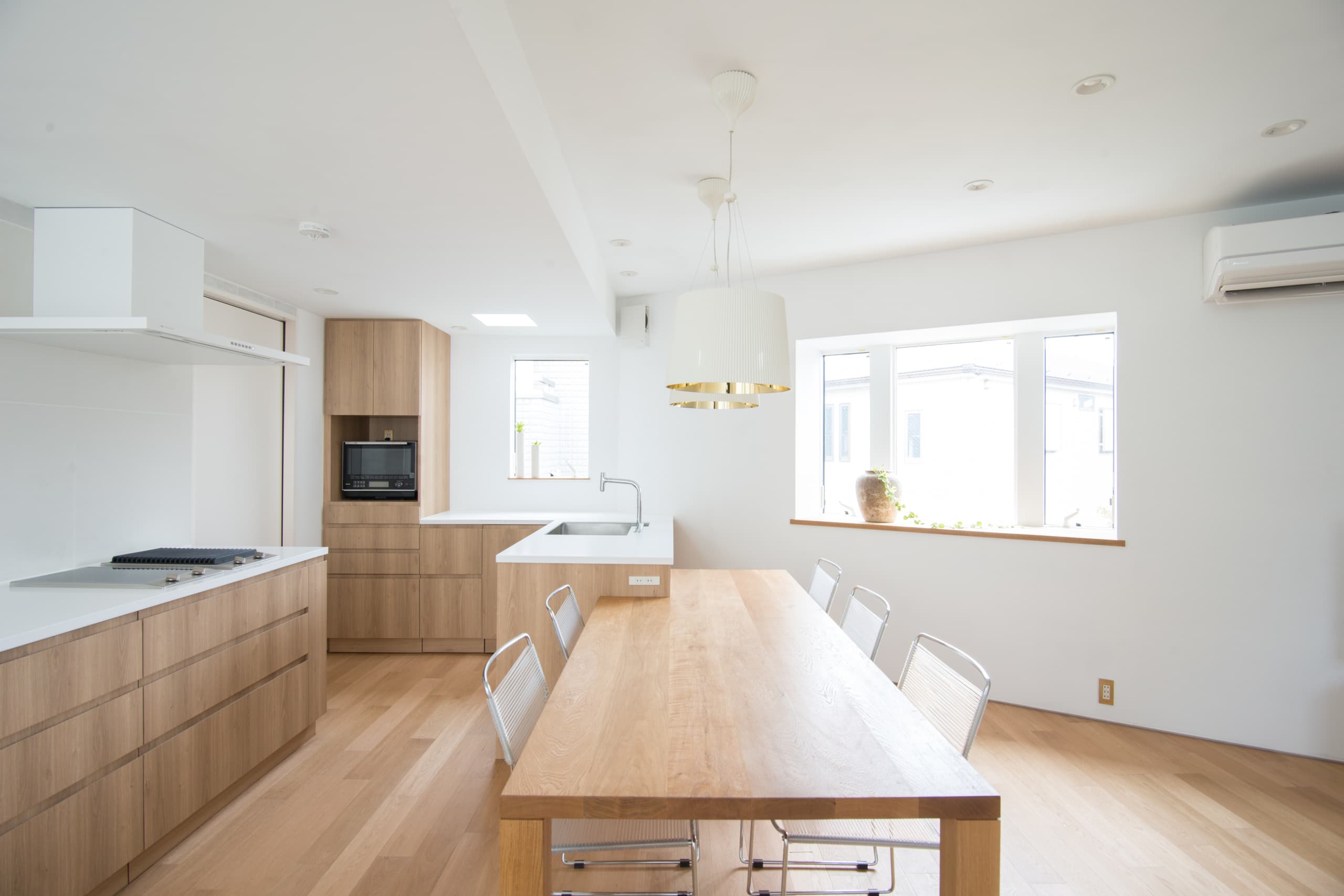 生活の中心であるLDKは2階の壁を取り払った大空間に配置。広く明るく気持ちの良い空間になりました。フルオーダーのキッチンは、コンロやグリルなどのパーツから、使う人の動きに合わせた配置にまで徹底的にこだわった一台です。