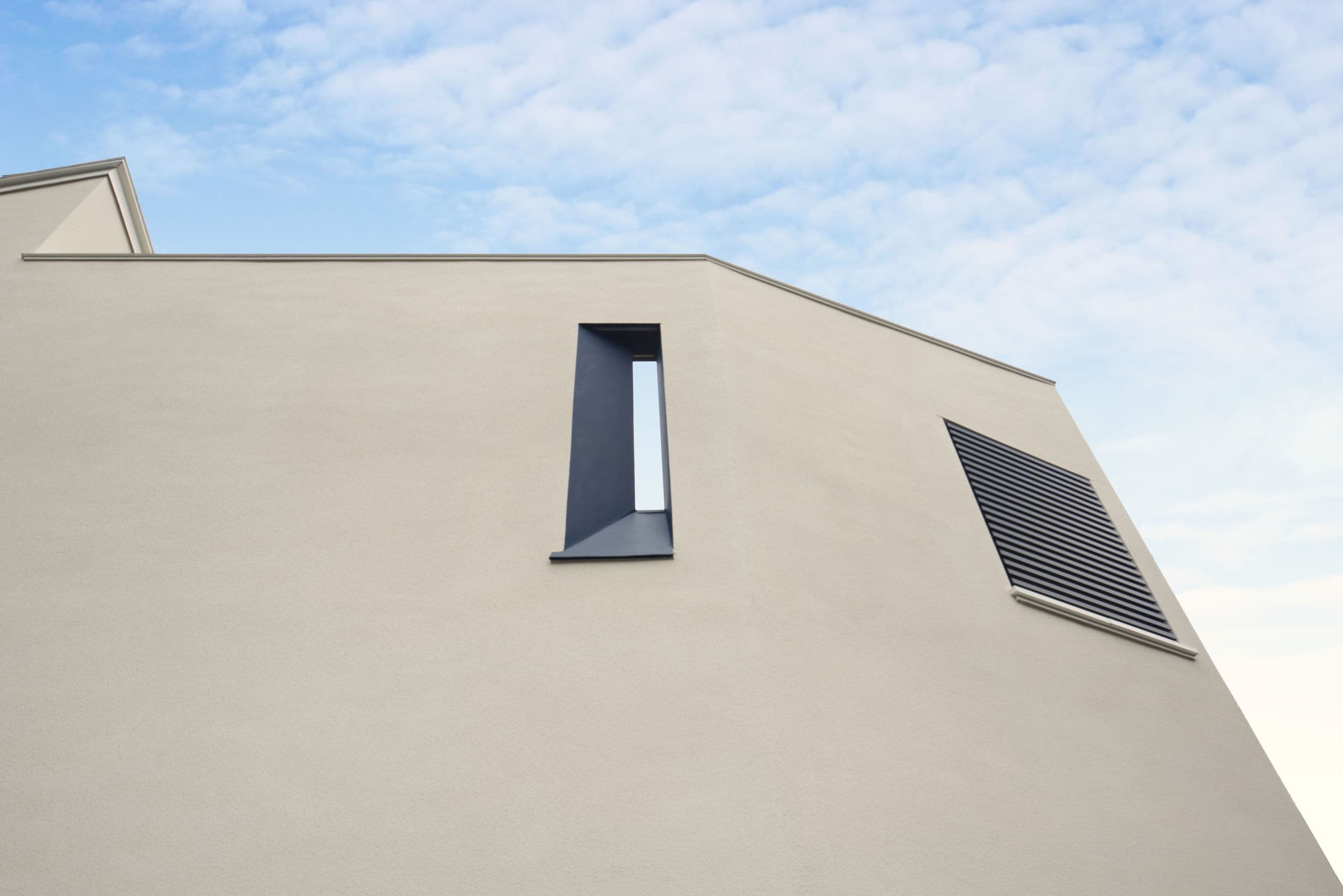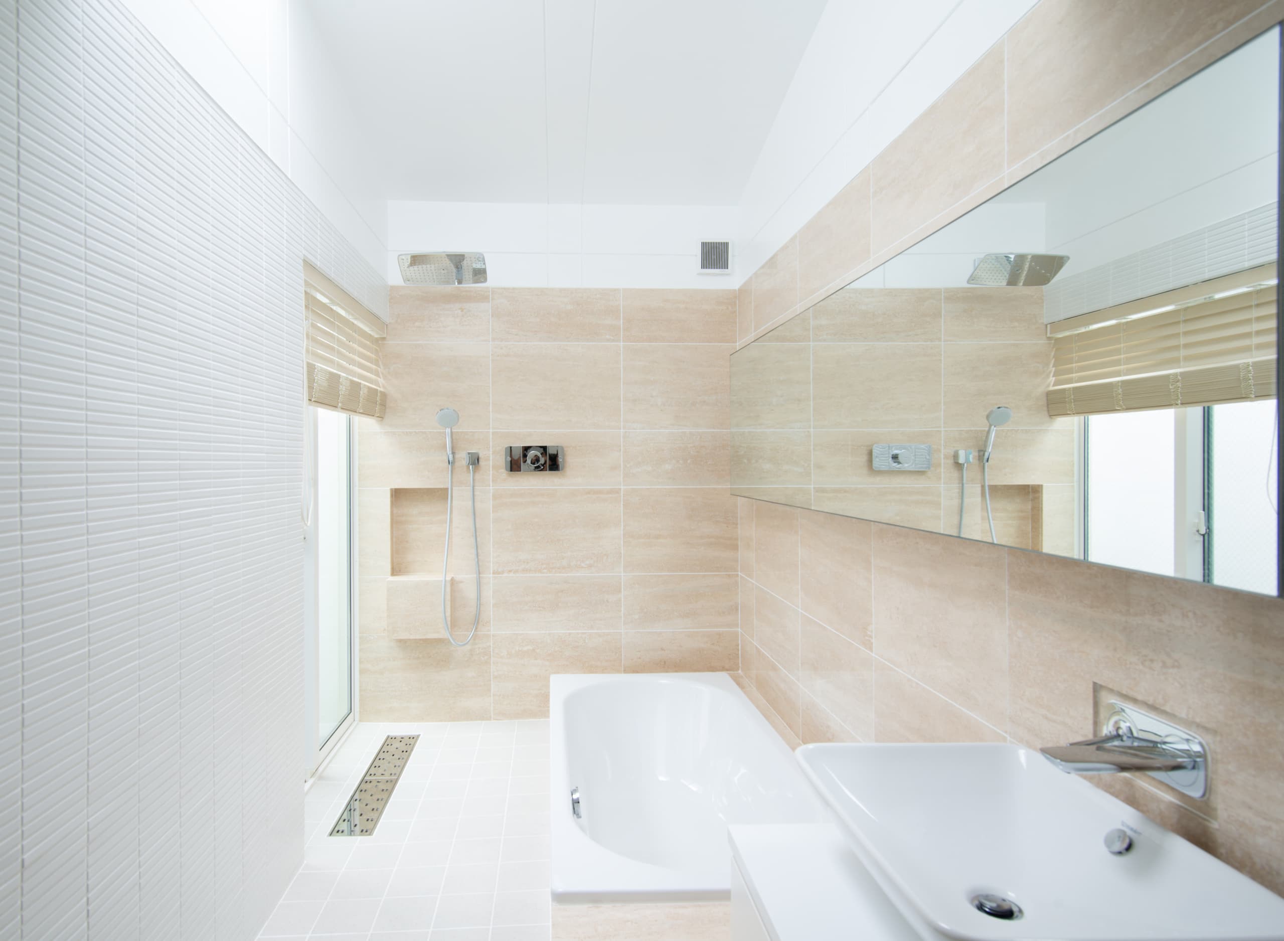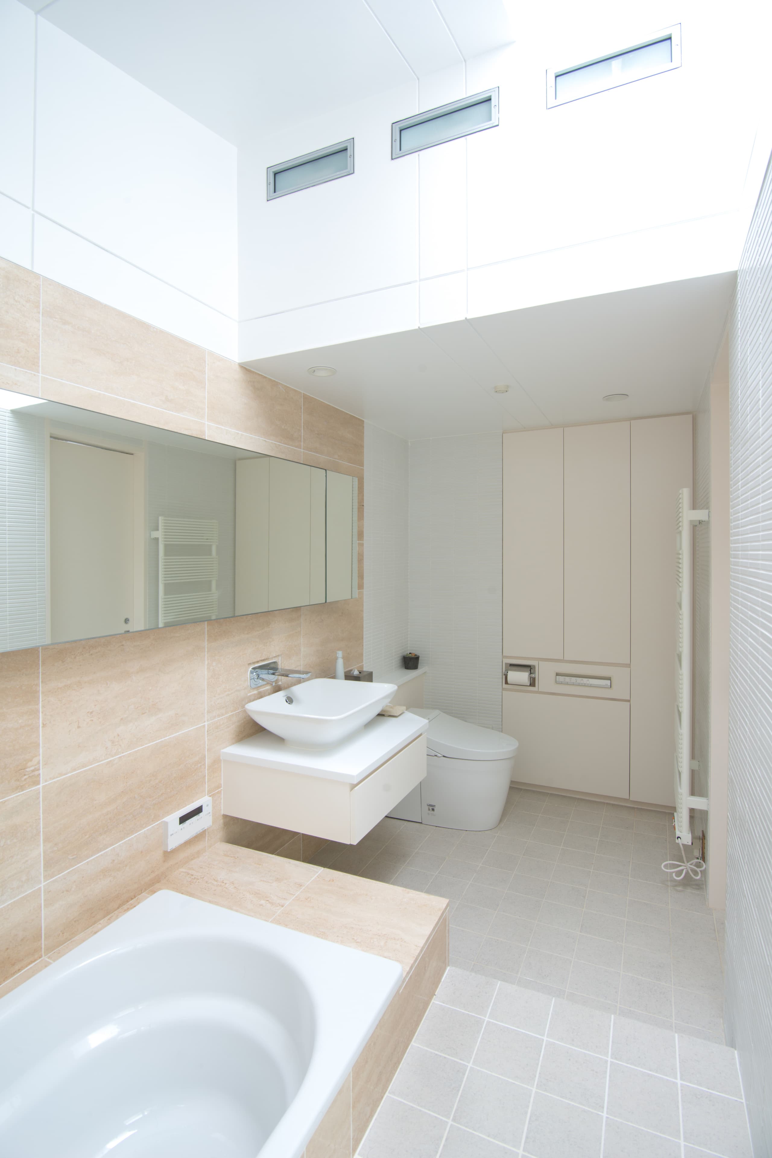 浴室、洗面室、トイレは一体となっています。床はタイル貼り、壁には天然石のトラバーチンを使用。鏡や洗面台もフルオーダーで設計しました。浴室とリビングからはバルコニーに出ることができ、屋上へとつながってゆきます。
