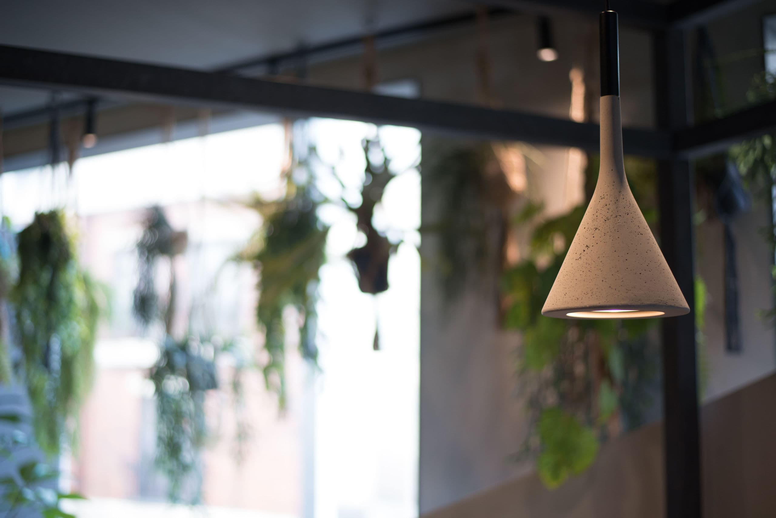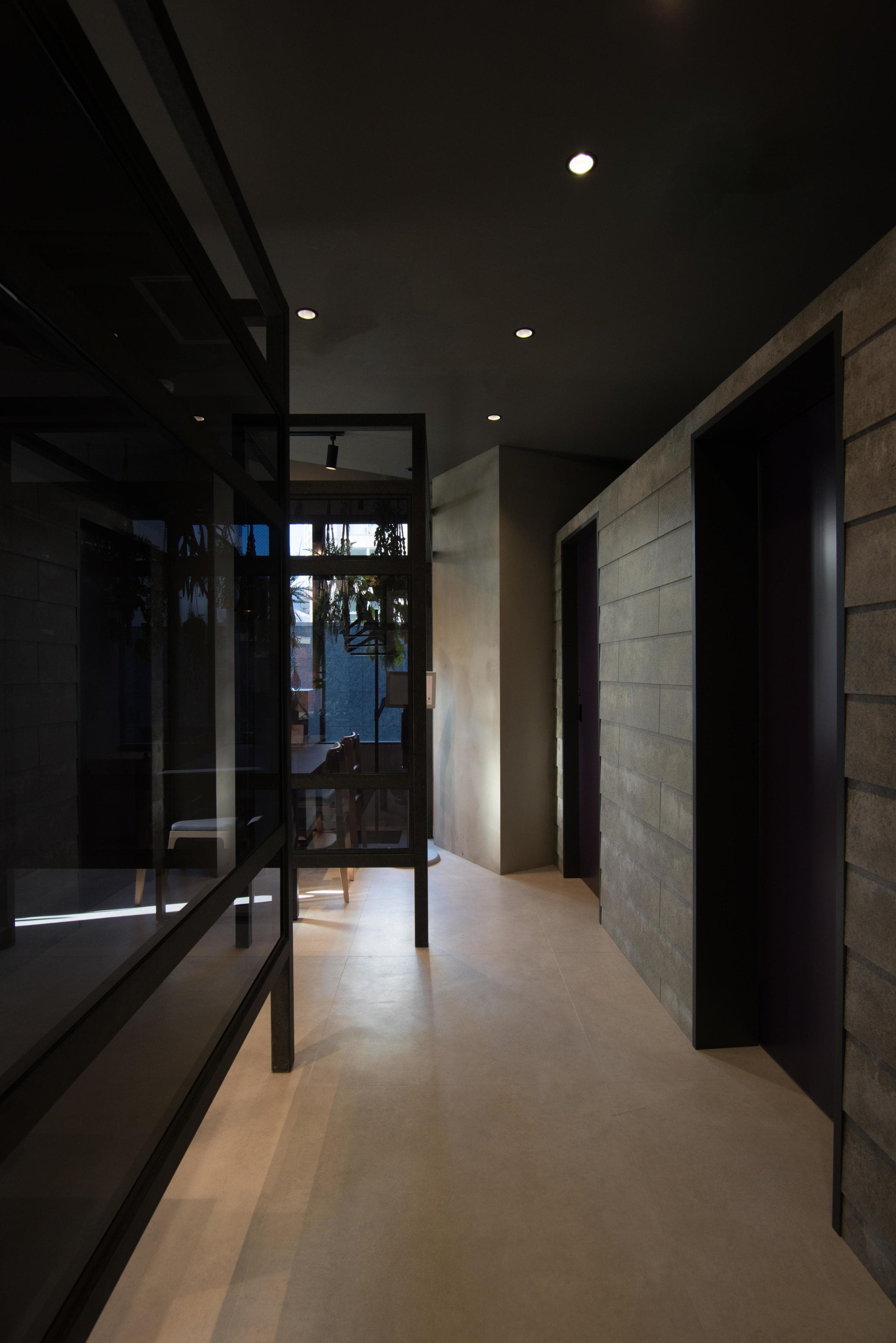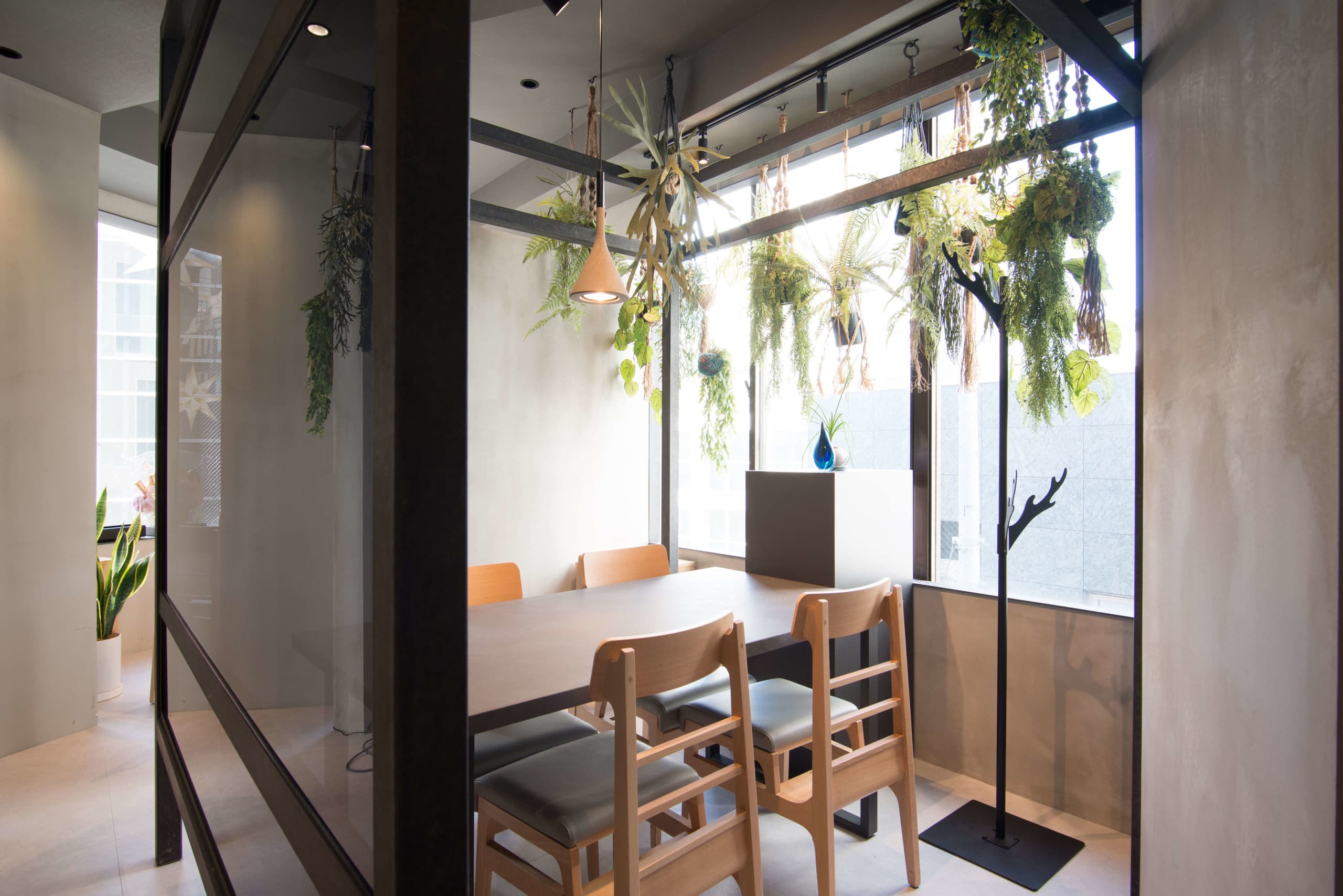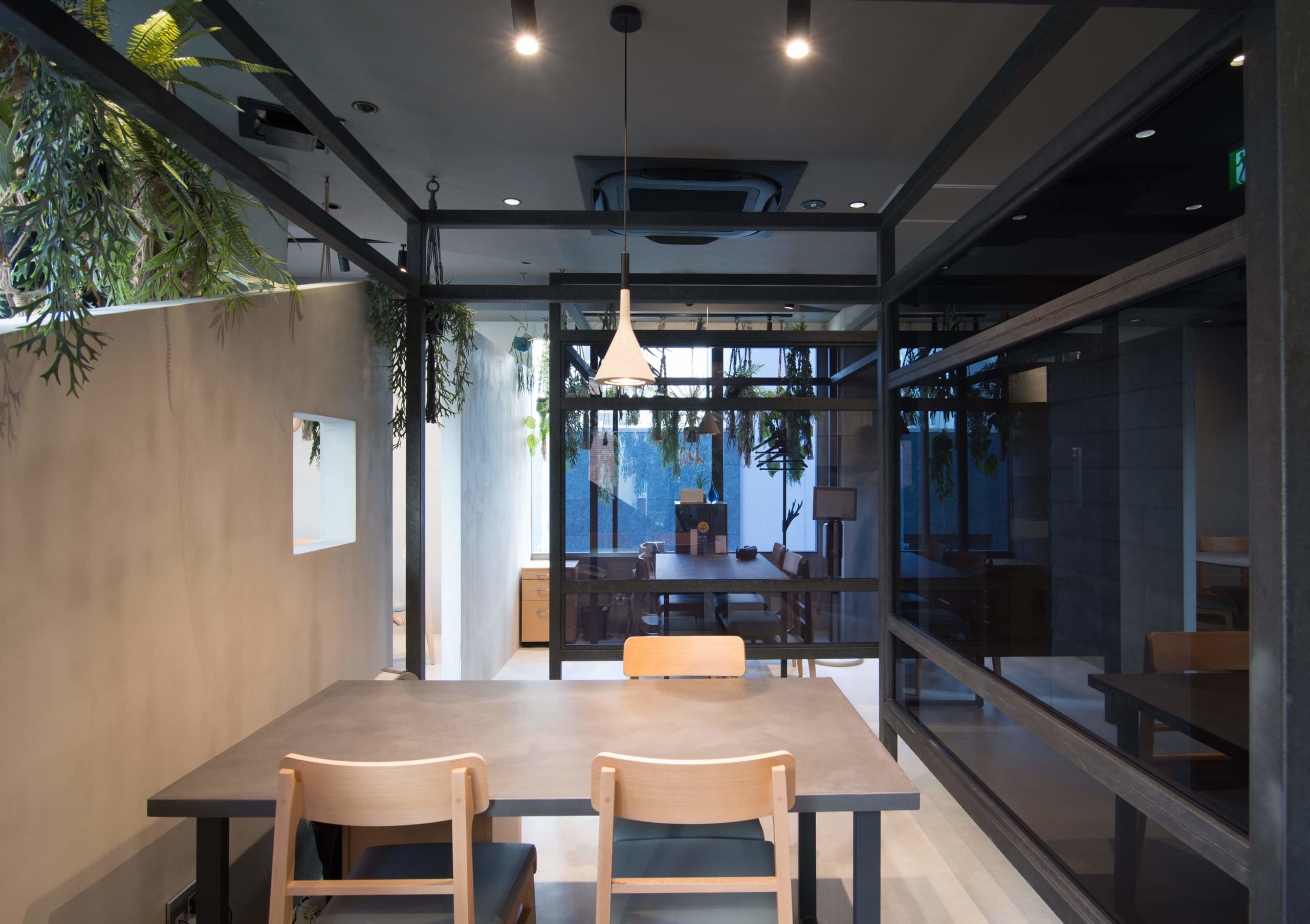 コンクリートに鉄格子、ガラスからなるモダンな空間に植栽で彩りを加えた内装設計。