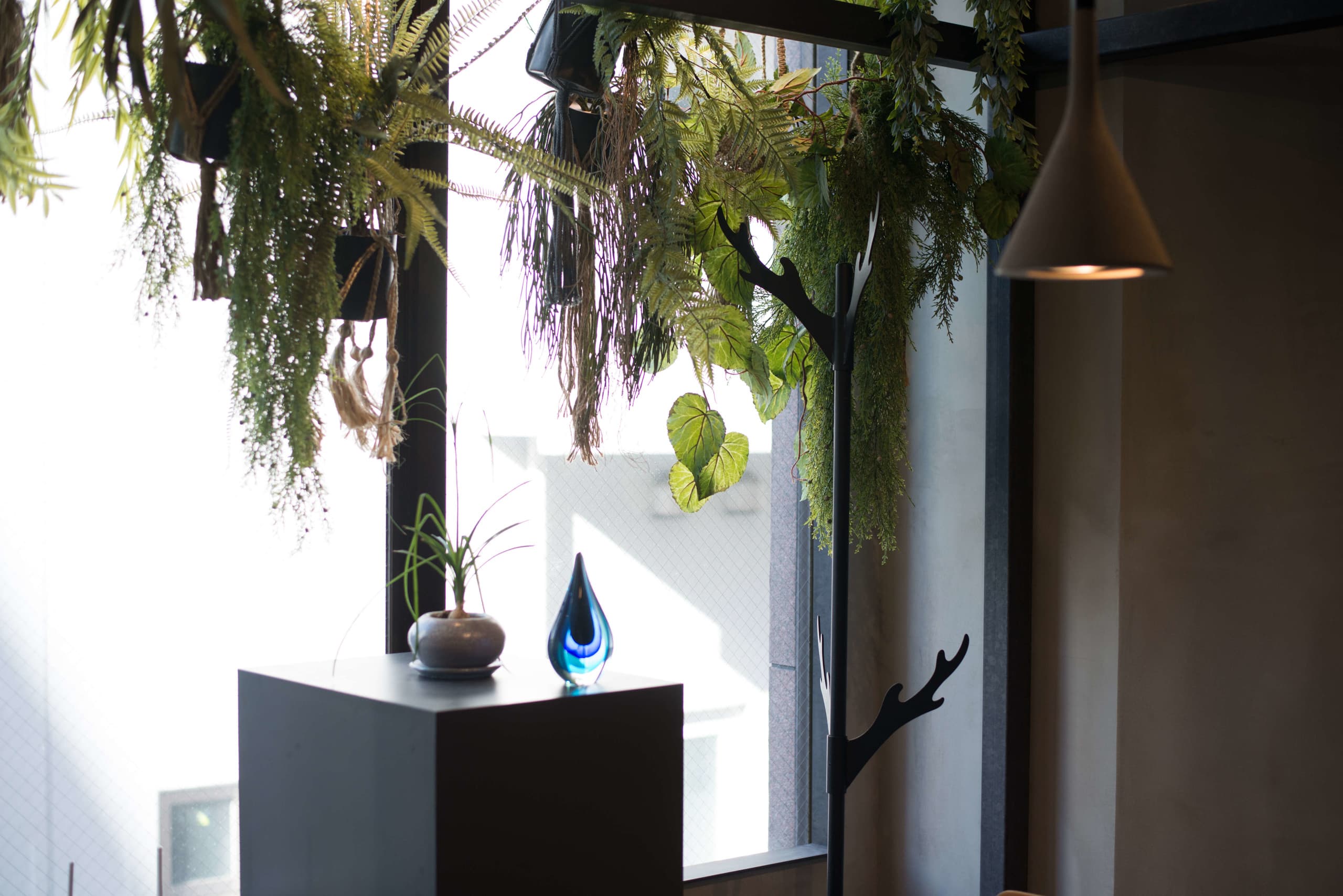 植栽は本物ではなくフェイクグリーン。日々業務が忙しい不動産店スタッフのことを考えて、手間をかけずに済むように提案しました。