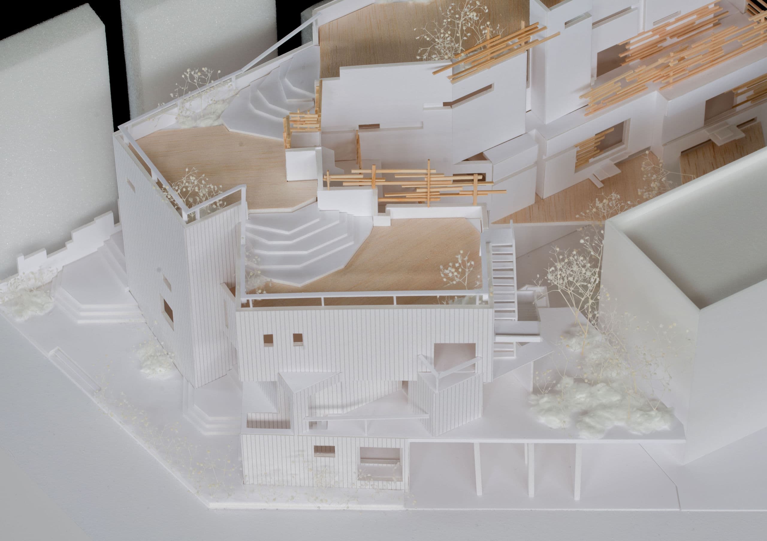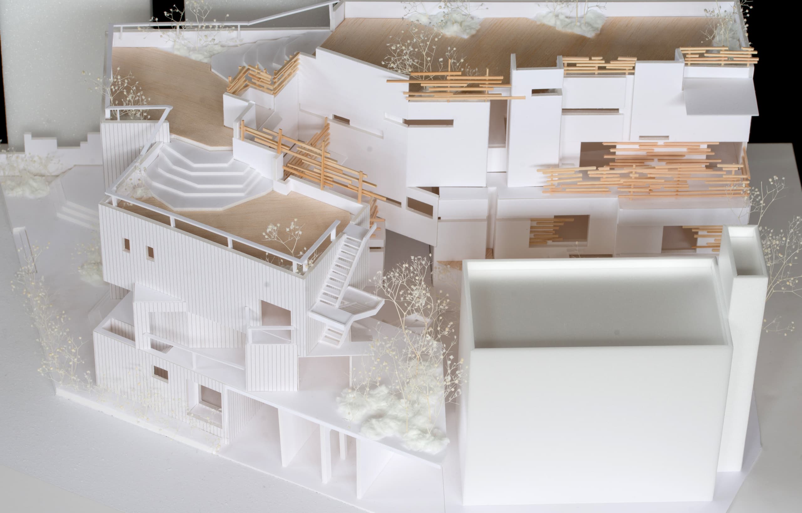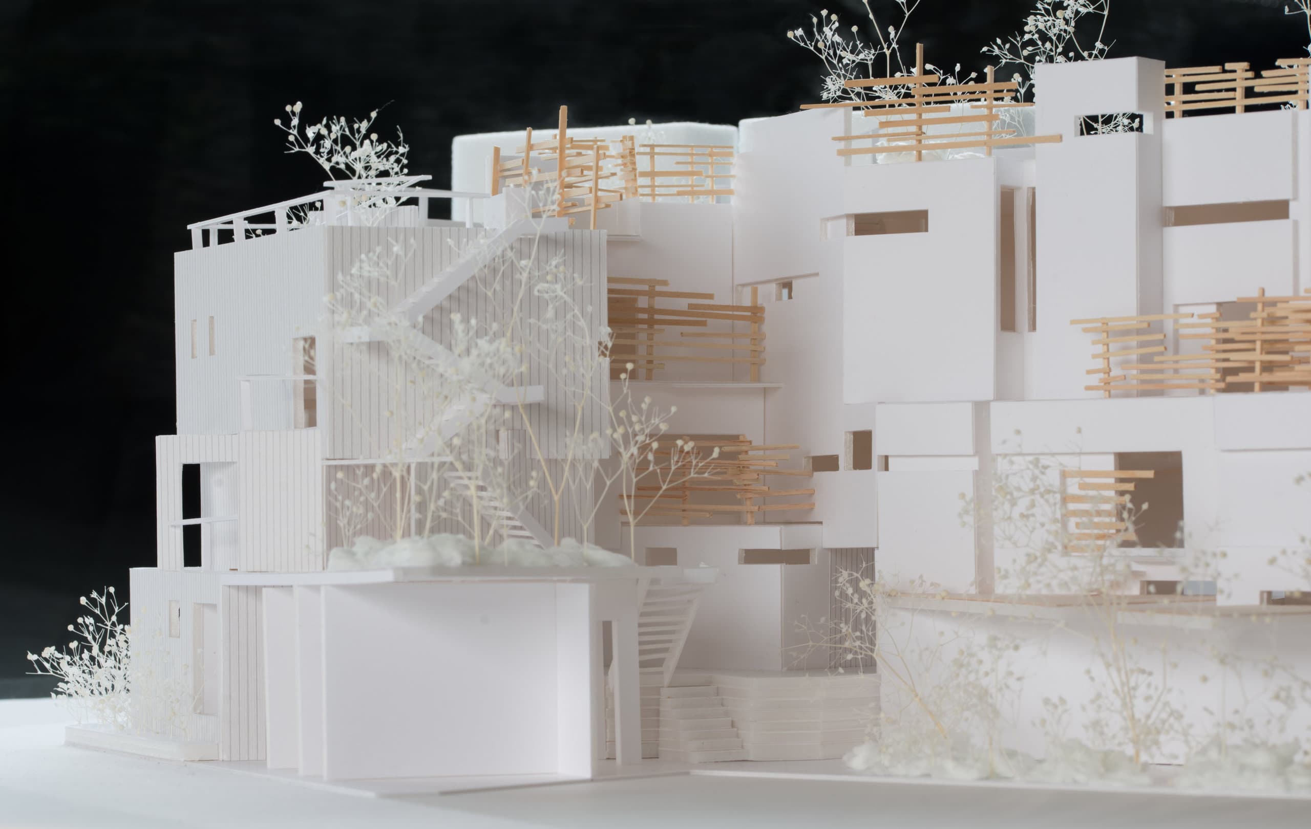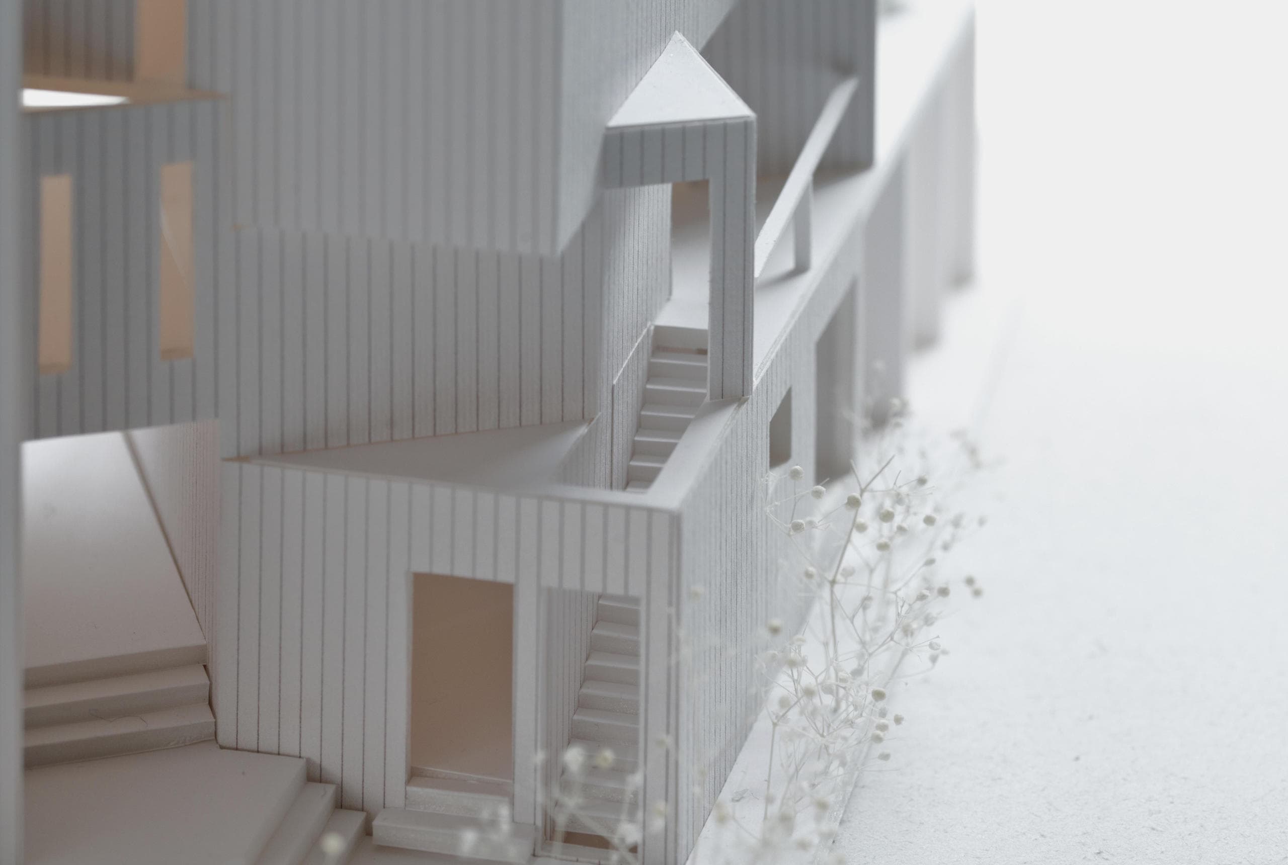 折れ曲がった形で配置されている建物は全部で13戸。自然発生した集落をイメージし、整理されていないランダムなデザインとしています。